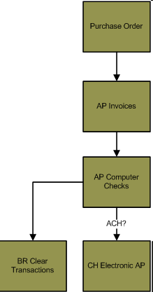 The Electronic AP process allows you to pay AP module vendors electronically using ACH transactions rather than generating a physical check in the Computer Checks process. In order to use this process, you must set up a relationship with a bank that processes ACH transactions.
