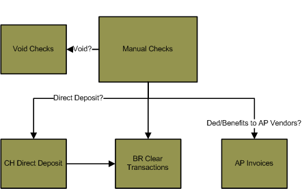 The Manual Check process is used to enter a check into the Payroll module that has been generated outside of the application and given to an employee. For example, during implementation the Manual Checks process is used to bring employee W-2 totals up to date from the previous software and input checks that were issued from the previous software. The Manual Checks process can also be used to enter an accrual adjustment. Click here for information on creating an accruals adjustment in the Manual Checks process.