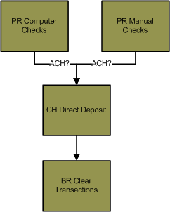 The Clearing House module Direct Deposit process is used to create an export file of Payroll module employee direct deposits. The export file is sent to an ACH processing bank, which processes the ACH transactions, removing the deposit amounts from a bank of your organization and places the funds into the bank accounts of the employees.