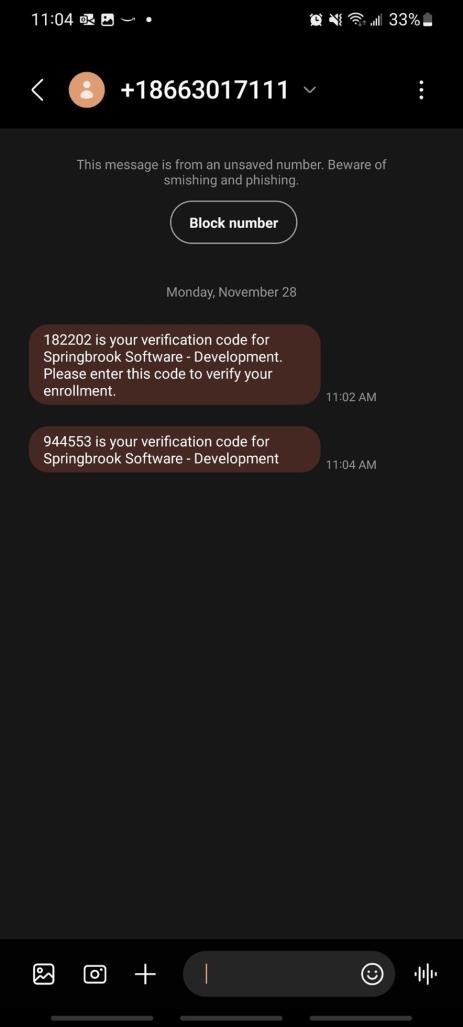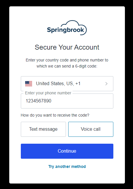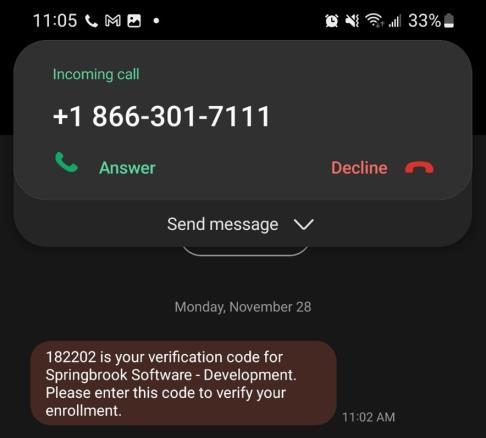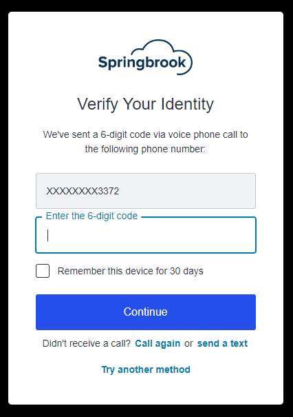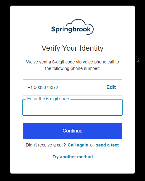 The phone option allows you to associate a phone number to receive authentication codes via either an SMS / Text Message or Voice Call. Springbrook’s toll free number for delivering these codes is 1-866-301-7111.