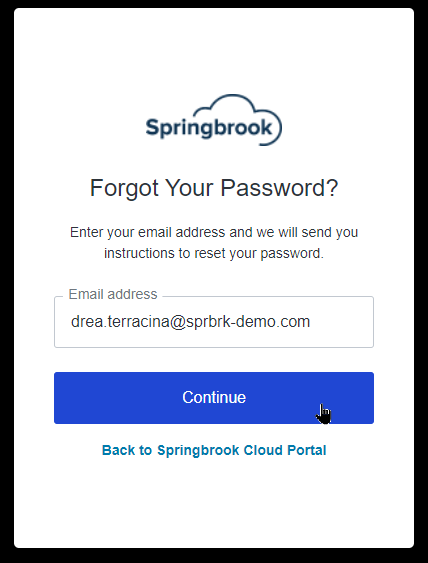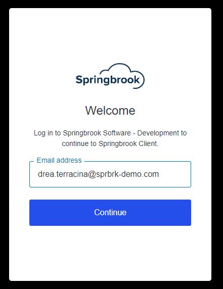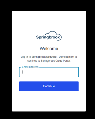 Follow the link to http://portal.springbrooksoftware.com/ to access your Springbrook applications. At the Login step enter the email address associated with your Springbrook User and select continue.