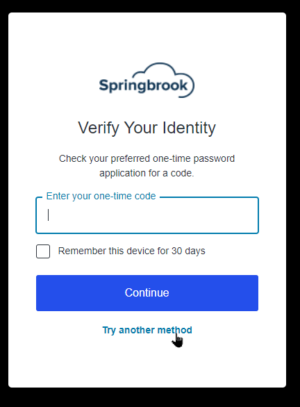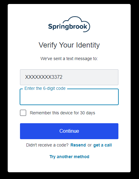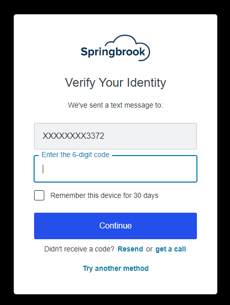 You can select the Remember this device for 30 days option to be presented with the requirement for second factor authentication less frequently. Clearing browser cookies or accessing Springbrook from a different machine or browser will require you to complete second factor authentication.