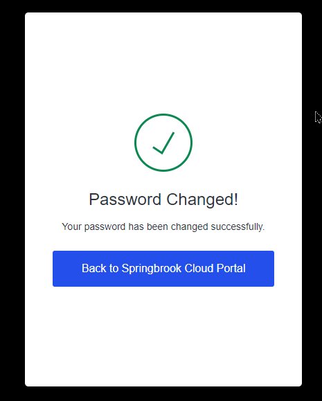 After successfully setting the password, you are given a confirmation message and should select the Back to Springbrook Cloud Portal option to return to the Log in window.